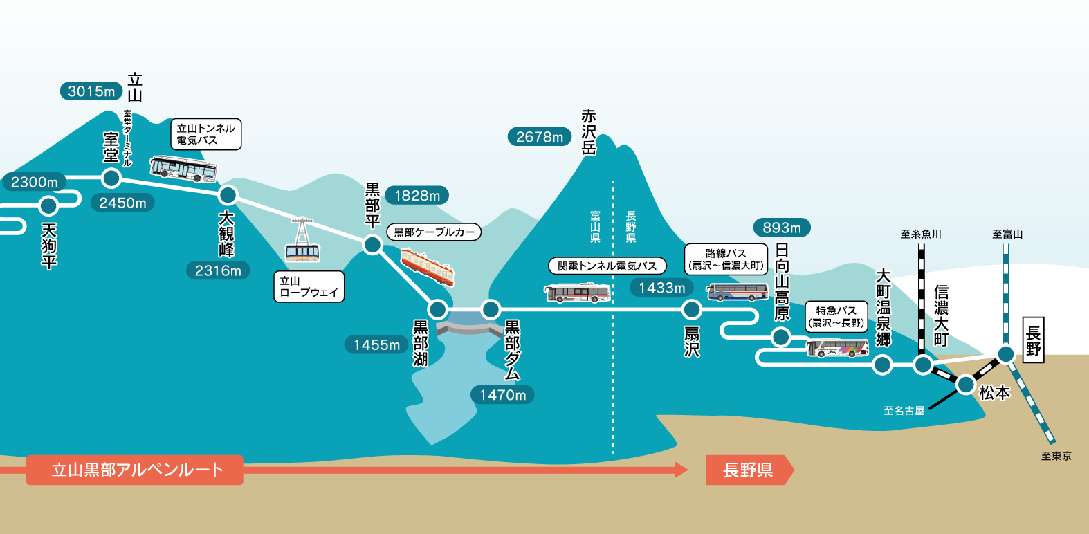 取り扱い区間は、扇沢〜黒部ダム、扇沢〜室堂の片道もしくは往復と、扇沢〜大観峰、扇沢〜黒部平の往復です。