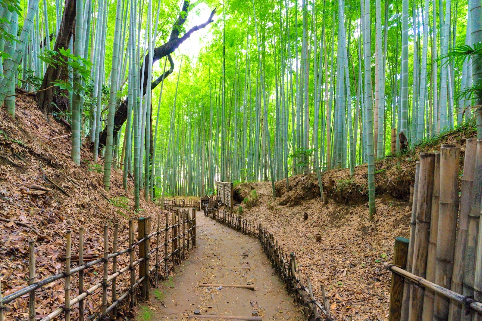 道の両脇にはその名の通り竹を縦横に組んだ「四ツ目垣」、御簾(すだれ)を下げたような形状の「御簾垣」、竹を割らずに丸竹のまま垂直に並べた「鉄砲垣」などの竹垣が効率的に配され、竹垣のミュージアム的な雰囲気も。