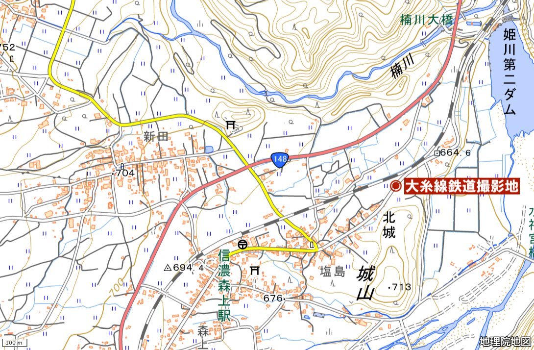 大正時代に入り、荷車や馬車が使われるようになると川沿いの平坦地に道が移りますがあ、その旧国道沿いにあるのが、ここで紹介する鉄道撮影ポイント。