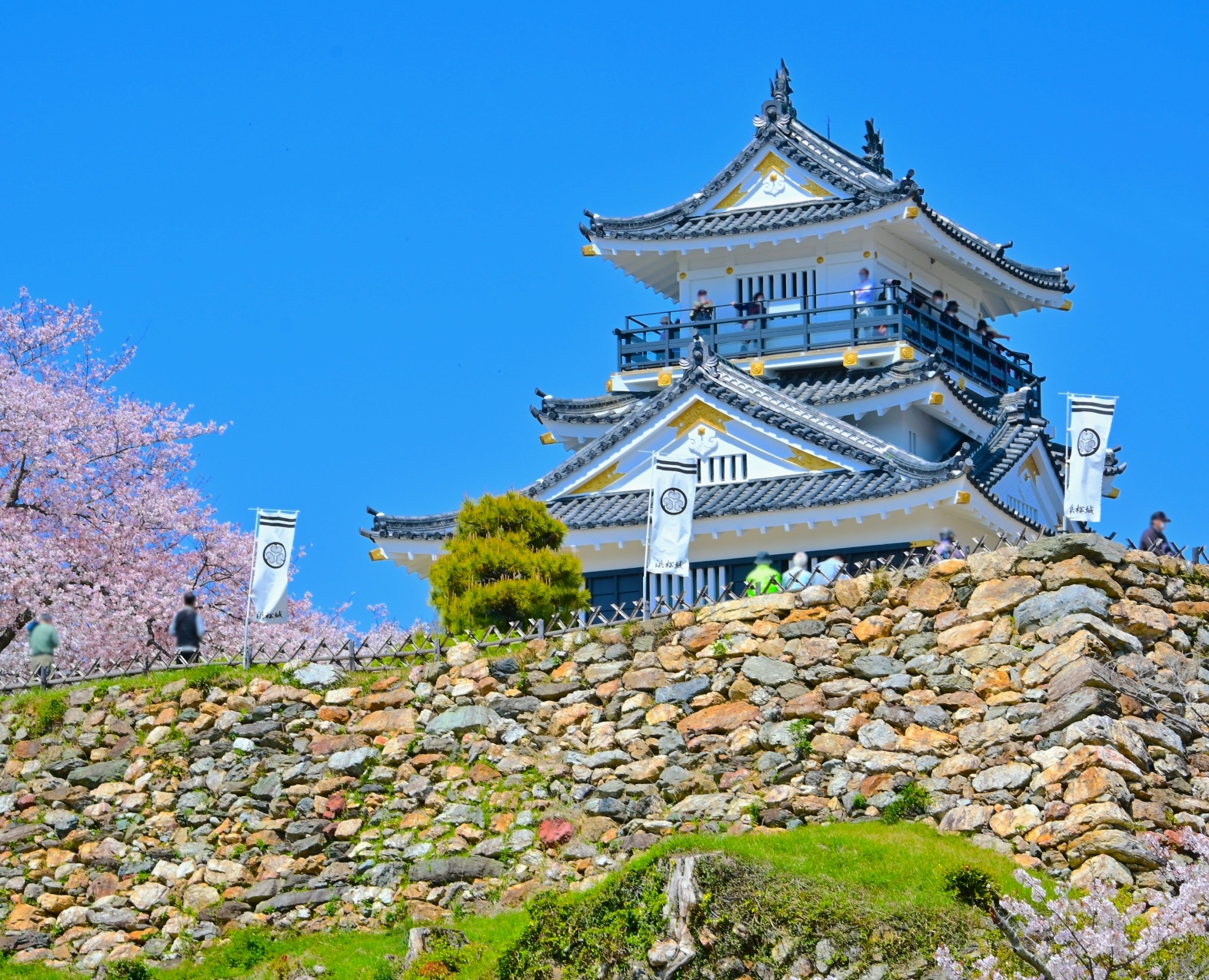 江戸時代には浜松藩の藩庁となり、老中や京都所司代など幕府の要職を多数輩出した譜代大名が入城していますが、本丸にあった二重櫓が天守代用とされていたため、天守はなかったと推測されています。