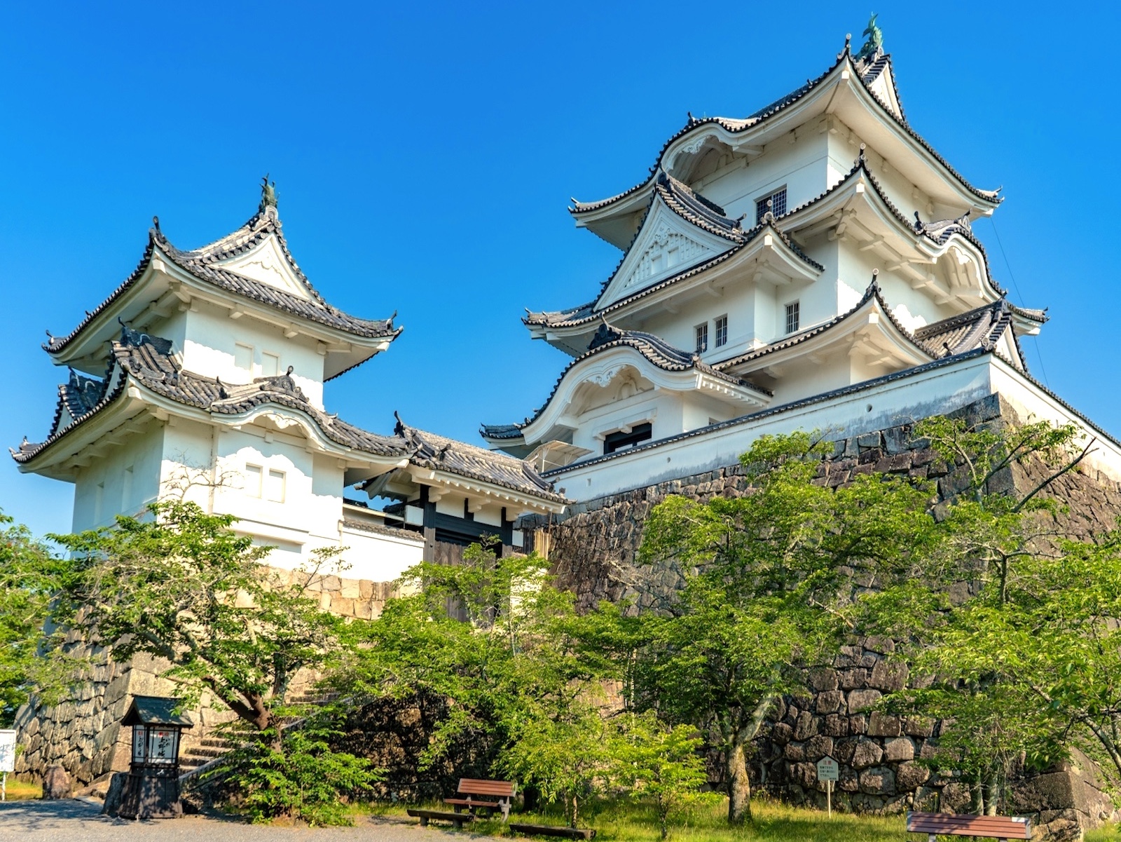 藤堂高虎が築いた天守台に、木造本瓦葺の3層3階の大天守と2層の小天守という複合式天守閣を建てたのです。