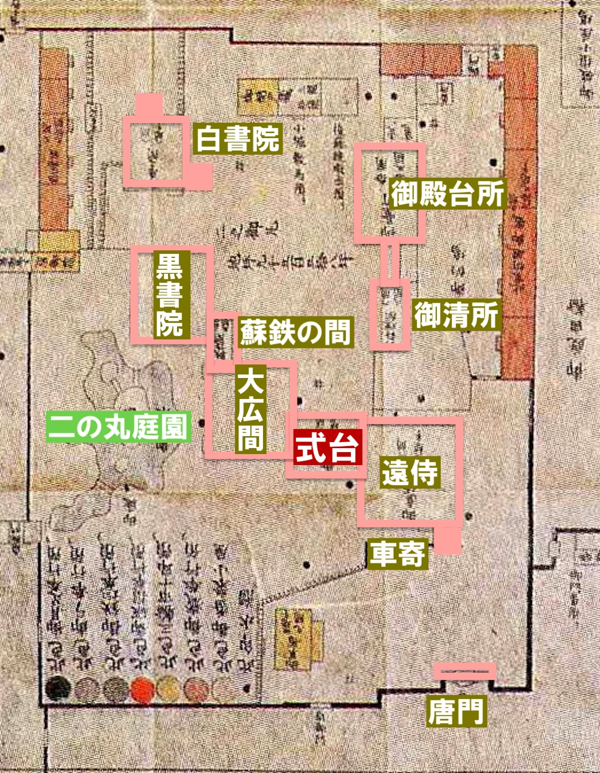 大坂(現・大阪)など西国の監視、徳川将軍の京滞在時の宿舎として築城されたのが二条城。将軍の宿所、そして諸大名や天皇からの勅使の接待所となったのが、二の丸御殿です。車寄から内部に入り、遠侍を抜けると式台です。式台の間、老中の間の2間しかない建物で、将軍への用件や献上物を取次ぐ場所でした。