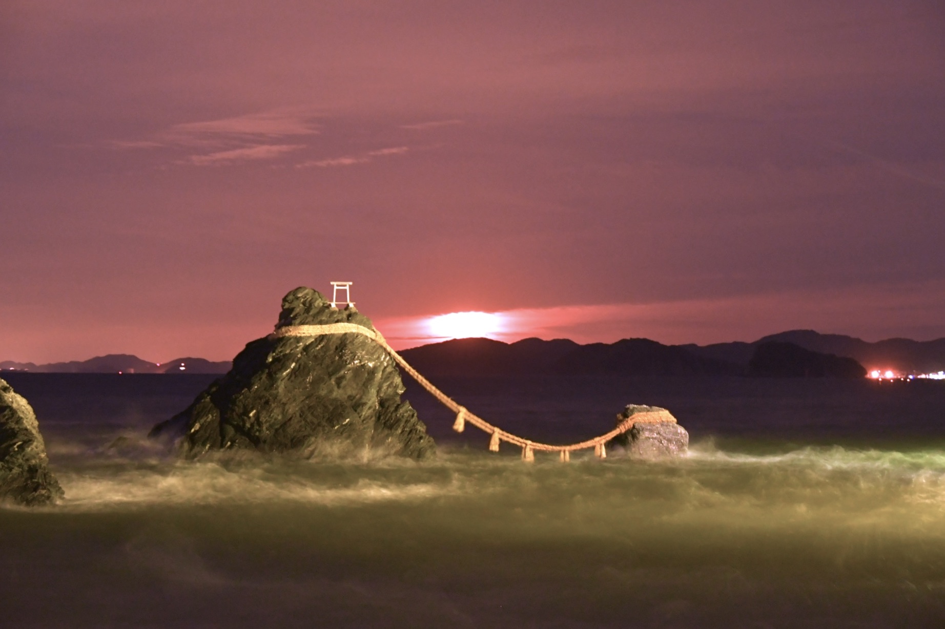 三重県伊勢市の二見浦(ふたみがうら)にある夫婦岩(めおといわ)といえば日の出の名所ですが、実は冬至を基準に10月~翌年1月の満月の日、『夫婦岩からの月の出』が観賞可能。夫婦岩の間から月がほぼ満月で昇る不思議な光景で、二見浦の月見はあまり知られていませんが、最近、注目度もぐんとアップしています。