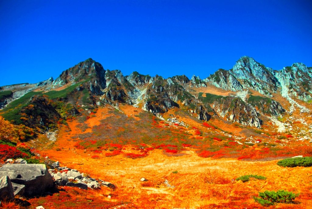 中央アルプス宝剣岳(標高2931m)直下にある巨大なカールが千畳敷カール。カールとは、氷河期に形成された圏谷地形。すり鉢を縦に割ったような形で、底部から見上げると、特大のお椀にちょこんと立っているような感覚。底部は氷河期の名残の高山植物が咲くお花畑で、中央アルプスを代表するアルペン的な光景を得ることができます。