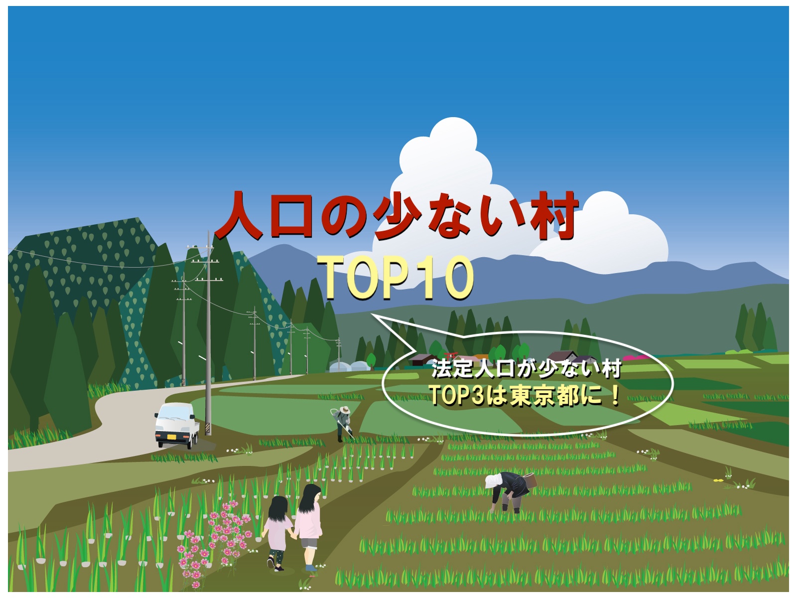 地方自治法によって定められる「村」。人口5万人以上が市制要件ですが、町制は都道府県の条例で定められるため、異なっています。村に関しては法律的な要件はないので、昔からの村名が現代にも継続している歴史的な名称というケースということに。人口の少ない村は、離島が多いので、TOP3は東京都内にあります。