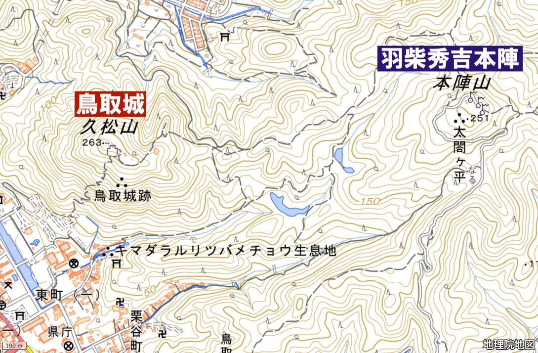 羽柴秀吉は、鳥取城の建つ久松山(263m)を眼前にする山上(251m)に陣を構えます。