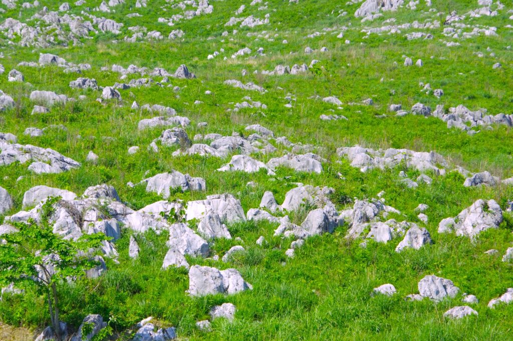 水に溶けやすい石灰岩の性質からドリーネ(doline)、ウバーレ(uvale)と呼ばれる凹地が形成され、地中には雨水などの浸食によって誕生した鍾乳洞があります。